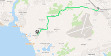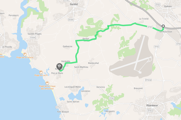 Au rond point prendre la direction de Guidel. Continuer tout droit pendant 1.5 km et tourner à gauche en direction de la gendarmerie maritime.